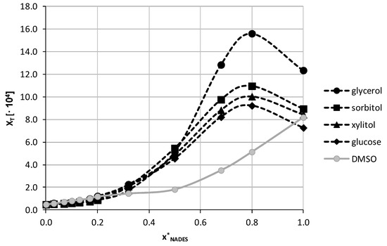 Solubility profile of theobromine at 25 °C in mixtures comprising NADES successfully diluted with water. On the abscissa, , represents values of the mole fractions of natural deep eutectic solvent in aqueous solutions. For comparison purposes solubility in DMSO + water was plotted as a function of (gray line).