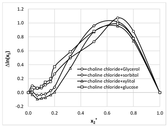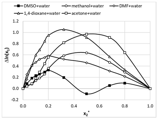 where represents the mole fraction of the organic solvent in aqueous mixture. The last term in the above equation,, accounts for the non-additivity of solubility in the binary mixture with respect of neat solvents. As the ratio of choline chloride and polyols used in NADES formulations was kept constant, the above equation can also be used for quantifying excess solubility in the case of such ternary mixtures. In this case denotes the NADES mole fraction in water containing ternary solvents. The results of the application of Equation (5) are provided in Figure 7 and Figure 8 for aqueous mixtures of organic solvents and NADES, respectively. It is interesting to see that all organic solvents introduce a positive non-additivity in the whole range of concentrations except for DMSO at unimolar proportions with water. The observed small excess solubility for mixtures of this solvent with water can be attributed to the high solubility of theobromine in neat DMSO. In this case small negative value of excess solubility have been observed for a broad range of mole fractions. The strongest non-additivity is observed for 1,4-dioxane+water mixture at = 0.3 and acetone+water at = 0.5. Additionally, for unimolar proportions of methanol and water strong positive non-additivity is observed. Interestingly, the maximum of cooperativity between DMF and water has been noticed for = 0.5.