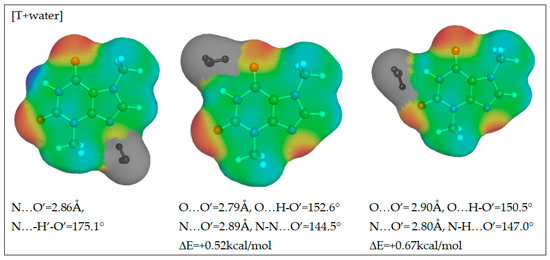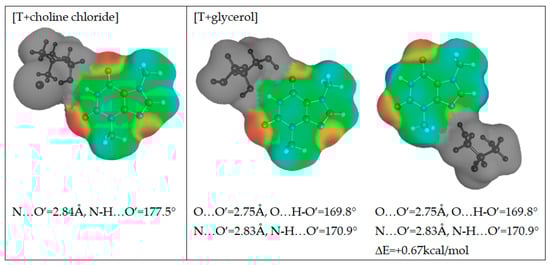 As it was mentioned in the above section, the application of a polynomial function for the approximation of solubility is very efficient and offers high accuracy of back-computed solubility values. Unfortunately, apart from proper interpolation, the deeper insight is missing what was the main motivation for application of the alternative approach termed COSMO-RS-DARE. This type of computations is an extension of the default application of COSMO-RS by redefinition of the studied systems through direct inclusion of strongly interacting molecules, which results in formation of intermolecular complexes. Additionally, in the context of the observed complex behavior of excess solubility, it is interesting to identify the contributions coming from the most dominant interactions between solution components. Theobromine can interact with solvent molecules due to its amphiprotic properties. It possess a proton donating nitrogen atom at the pyrimidine ring and a non-methylated nitrogen atom at the imidazole fragment. This allows for diverse contacts and even dimer formation. The former site will be active with such solvents as DMSO, DMF, acetone and 1,4-dioxane. Water and alcohols can be involved in interactions with theobromine utilizing both sites. To further explore this idea, direct contacts of theobromine were analyzed in terms of the energy and structure of the most probable pairs formed between solute and solvent. Hence, all of new components of the mixtures used for solubility predictions can be represented by a X + Y = XY scheme, where X and Y represent any of the solution components and XY stands for the pair involving theobromine. In the case of X = Y the theobromine dimer is obtained, otherwise hetero molecular complexes are considered. The structures of all these pairs were derived from extensive conformation analysis according to the description provided in the methodology section. Detailed information on structural parameters of structures identified as the most stable are provided in Supporting Materials in Figures S1–S4. Here, only exemplary pairs are discussed. The most interesting case is the interaction of theobromine with water. In Figure 10 the three most energetically favorable pairs are presented in the format corresponding to the “mcos” file directly used in COSMO-RS computations. As it was already mentioned, the gray part of electrostatic potential covering atoms of water is not used in the solubility computations since all are considered as pseudo-conformers of theobromine. It is interesting to notice that water can be attracted by theobromine not only by all electronegative centers but also by the acidic hydrogen atom connected to the carbon atom situated in between carbonyl groups of the six-membered ring. The most stable water–theobromine complex is formed by the acceptor from the imidazole ring, however other hydrogen bonded pairs are very close in energy. Similar type of contacts can be found for interactions of theobromine with alcohols. To the contrary, the only favorable contacts of non-protic solvent molecules such as DMSO, DMF, 1,4-dioxane or acetone are possible with the most acidic site of theobromine (N1-H). Schematic representations of electrostatic densities are provided in Figure 11. Taking into account the geometric features of the formed hydrogen bonds, it is possible to conclude that they all belong to strongly bonded complexes. Indeed, HB bonds are short and HB angles almost right, suggesting a highly linear hydrogen motive. In NADES solutions there are possible alternative structures, much richer in hydrogen boding. This is not only related to the higher number of donating centers but also to higher flexibility of polyols, resulting in larger number of potential conformations. Two exemplary cases are provided in Figure 12, demonstrating the most favorable pairs of theobromine with choline chloride and glycerol. The structure of choline chloride intermolecular pairs with theobromine is similar to the one found in the cases of non-protic solvents and by analogy it should be also regarded as very strong. Glycerol is able to utilize two hydroxyl groups for embracing both oxygen centers of Theobromine. Additionally, an alternative motive can be observed, which is only slightly energetically disfavored. This pair is stabilized by a hydrogen bond formed between the acceptor center of theobromine (N center located on imidazole ring) and donor coming from one of hydroxyl groups. Other polyols can form analogical pairs, which structural characteristics is provided in Supplementary Materials.