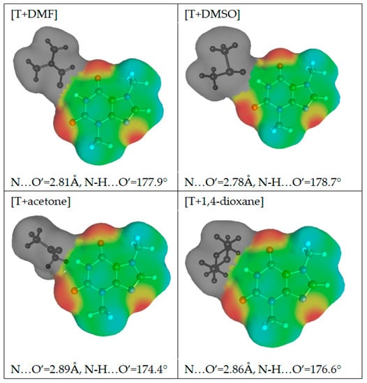 Hence, the methodology offered by COSMO-RS-DARE relies on replacing the common interaction energy between surface segments, which includes misfit, hydrogen bonding and van der Waals forces, with the above formula related to the interaction of two dimerization segments. The parameter values in Equation (2) can be estimated through the fitting of the computed solubility values to the experimental ones for each considered solvent and temperature. As the usage of COSMO-RS-DARE protocol for solubility computations was already successfully tested [88], the methodology was extended in this study to also include binary solvents mixtures. This procedure relies on treating the considered solvent compositions as individual solvents. Additionally, for the performed COSMO-RS-DARE computations only the pairs formed by theobromine itself or with solvent molecules were taken into account, as well as only one interaction parameter was set for all such pseudo-conformers. The first of these simplifications ignores contacts resulting from the interactions of solvent molecules while the second one assumes that the electron density changes upon formation of complexes are of similar magnitude.