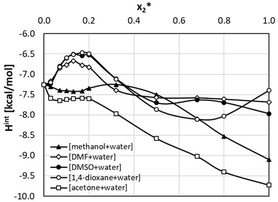 When analyzing the obtained results, it is evident that two different patterns are observed. For DMSO and DMF no cosolvation effect was obtained as the highest solubility was found for the neat solvent (xT = (8.20 ± 0.04)∙10−4; c = 2.09 ± 0.02 mg/mL and xT = (3.05 ± 0.05)∙10−4; c = 0.72 ± 0.01 mg/mL, respectively). There can be observed a gradual increase of theobromine solubility with increasing organic solvent content, although for DMF it is almost a linear increase, while in the case of DMSO two linear sections are visible, with an inflection point at the organic solvent content of = 0.5. A different behavior was found for the three remaining organic solvents and in these cases a solubility maximum was achieved for a water-solvent composition with a molar ratio equal 1:1. For 1,4-dioxane the solubility of theobromine in the most optimal composition was found to be xT = (2.23 ± 0.01)·10−4; c = 0.92 ± 0.01 mg/mL, while for acetone and methanol it was xT = (0.89 ± 0.03)·10−4; c = 0.35 ± 0.01 mg/mL and xT = (0.87 ± 0.02)·10−4; c = 0.53 ± 0.01 mg/mL, respectively. Interestingly, for the last two solvents the increasing solubility order is different than for neat solvents. Additionally, the general trend of solubility changes is different for 1,4-dioxane than for the two latter solvents. After reaching the point of maximum solubility, the values of theobromine mole fraction in the mixture decrease only slightly in the case of 1,4-dioxane, and the value of solubility in the neat solvent is equal almost 74% of the maximum solubility value achieved at = 0.5. For methanol and acetone a much more pronounced decrease of solubility is observed and the solubilities for neat solvents are 50% and 26% of the maximum value, respectively. Detailed results of theobromine solubility in both neat organic solvents and binary solvents with water are presented in Tables S3 and S4 in Supplementary Materials.