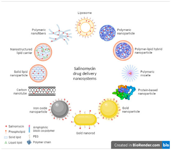 Drug delivery systems for salinomycin (Figure created with BioRender.com [accessed on 25 June 2021]).