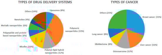 A summarized representation of the types of nanosystems (left) used in various cancer models (right), indicated as percentages of the studies reviewed herein.