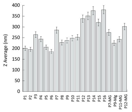 To get information about the influence of composition on size distribution of vesicular nanosystems, mean diameters and dispersity indexes were evaluated by PCS. As reported in Table 2 and depicted in Figure 1, mean diameters, expressed as Z average, ranged between 190 and 550 nm. Ethosome mean diameter was affected by the PC concentration, passing from 201 nm in the case of P1 (PC 0.6%) to 320 nm in the case of P15 (PC 2.7%). In transethosomes, T80 presence slightly decreased the mean diameter in the case of PC 0.9%, while at PC concentrations 1.8% and 2.7%, T80 0.2% and 0.3% led to a notable increase in mean diameter, namely +53 nm and +230 nm in the case of P7 and P16, respectively.