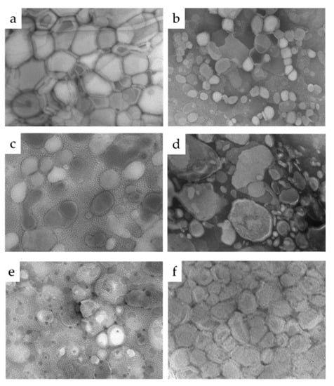 In order to better investigate the influence of T80 and F127 on morphology and inner structure of PC vesicular nanosystems, TEM analyses and SAXS measurements were conducted. Particularly, P7, P9, P11, P12, P13, and P16 were selected as representative examples of ethosome, transethosome, and plurethosome. As appreciable from the TEM images reported in Figure 2, ethosome (P7), transethosome (P12, P16), and plurethosome (P9, P11, P13) vesicles appear roundish, while their mean diameters correlate well with Z average values measured by PCS.
