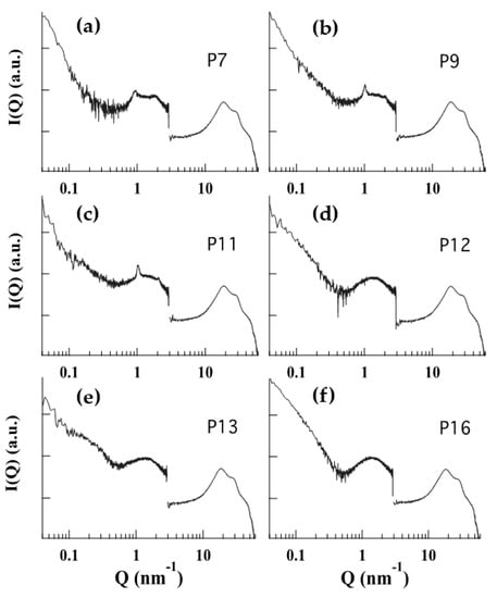 SAXS/WAXS profiles observed at 35 °C. P7 (a), P9 (b), P11 (c), P12 (d), P13 (e), and P16 (f).