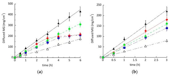 To get information about the influence of the different vesicular nanosystem compositions on MG diffusion kinetics, Franz cells associated to nylon membranes were employed. Nylon membranes are commonly employed in Franz cell experiments in order to compare the performances of topical formulations and for quality controls [,,,,]. Of course, natural membranes can provide more predictable in vivo drug permeation results with respect to synthetic membranes; nonetheless, their use can involve many inconveniences due to high costs, scarce availability, and ethical limitations. Moreover, the use of human and animal skin may imply variable results, risks of contamination, and special storage conditions. In addition, synthetic membranes such as the nylon ones are usually employed for quality control or to study drug diffusion thanks to their commercial availability, easy storage modalities, and highly reproducible results [].