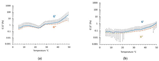 Since F127 is known to confer thermoresponsive behavior to aqueous vehicles, the rheological performance of plurethosomes was investigated. Particularly, to evaluate the role of PC and F127 on plurethosome rheology, P11-MG behavior was studied and compared to P7-MG. The elastic modulus represents the energy stored in the elastic structure of the formulation, while the viscous modulus reflects the viscous part or the dissipated energy [,]. Figure 5 reports the G′ and G″ moduli evolution between 5 and 50 °C, displaying low values for both samples: between ≈0.05 Pa at 5 °C and ≈1 Pa at 50 °C for P11-MG, and between 0.3 Pa at 5 °C and ≈40 Pa at 50 °C for P7-MG. The elastic modulus was slightly higher than the viscous modulus, with a minor increase upon heating. The low viscosity of plurethosomes and the absence of a thermoresponsive behavior is rather surprising, but two considerations should be made: (i) it is known that poloxamer aqueous solutions undergo thermoreversible gelation at F127 concentrations higher than 12% (w/v), whilst in a P11-MG nanosystem, F127 concentrations are 10-fold lower; (ii) the structural results by SAXS analyses suggest the positioning of F127 within the PC multilamellar vesicles, thus preventing a thickening effect of the dispersing phase []. Overall, G′ and G″ were higher for P7-MG than for P11-MG over the whole temperature range, which is in agreement with diffusion results indicating a higher diffusion coefficient in the case of P11-MG with respect to P7-MG.