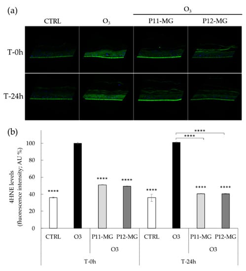 The antioxidant and anti-inflammatory effects of MG in vitro have been recently described; particularly, the increased potential in counteracting ox-inflammatory conditions when loaded in vesicular systems has been assessed []. In the present study, 3D human skin models were employed to investigate the transdermal potential of P11-MG and P12-MG and their protective effect against pollutants. In this regard, the protective effect of the encapsulated MG in counteracting the cutaneous O3-induced oxidative stress damage was explored by evaluating 4HNE protein adducts levels, which normally occur upon O3 exposure and represent a marker of lipid peroxidation []. This reconstructed human epidermis model was selected, since it accurately resembles the human skin. Indeed, the 3D skin model is an in vitro approach widely accepted to study cutaneous drug permeability. As of 2013, reconstructed skin models received Organization for Economic Co-operation and Development approval for the testing of skin corrosion, acute skin irritation, and phototoxicity []. These models well represent skin tissues as they are characterized by both the stratum corneum and the epidermic layers, which are the most external layers of the skin. In addition, the use of these models enables preventing the variability encountered when using human skin biopsies. Particularly, 3D human skin tissues pretreated with P11-MG and P12-MG were exposed to O3; afterwards, 4HNE protein adducts levels were evaluated by immunofluorescence staining directly post-exposure and 24 h later (Figure 6).