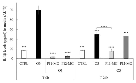 As depicted in Figure 6b, O3 exposure induced a significant increase in 4HNE protein adducts levels at both time-points (T 0 h and T 24 h) compared to untreated tissues exposed to air, while the topical administration of P11-MG and P12-MG halved the production of 4HNE levels, exerting protection against oxidative stress promoted by O3 exposure. Moreover, the green fluorescence intensity of P11-MG and P12-MG samples (Figure 6a) was minimal along the stratum corneum and epidermis, suggesting the ability of vehicles to promote MG delivery in the deeper layers of the skin. Additionally, this effect has been maintained even 24 h after O3 exposure, indicating the vesicle capability to retain the drug and prolong its release. Afterwards, considering the severe direct correlation between cutaneous oxidative stress and inflammation on skin upon pollutants exposure, the release of proinflammatory cytokine IL-1β was determined in 3D skin models to evaluate the inflammatory conditions upon O3 exposure. Figure 7 reported the analysis of IL-1β levels (pg/mL) expressed as AU% in media of 3D skin models treated with P11-MG and P12-MG.