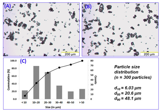 Representative micrographs (10 × objective) depicting particle size distribution of 1:1 ribavirin:poloxamer microparticles (A,B). Measurement of Feret diameter (n = 300) of the particles resulted in the particle size distribution shown in (C).