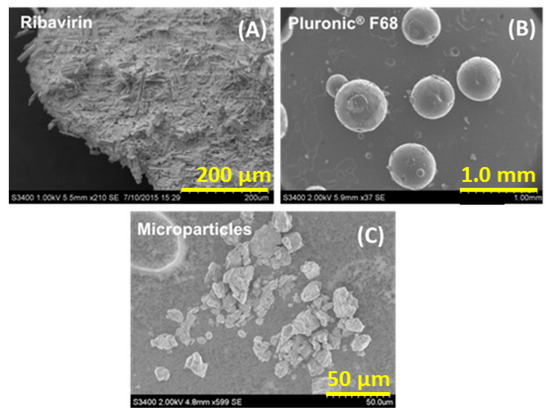Scanning electron micrographs: (A) unprocessed ribavirin, (B) Pluronic® F68 (poloxamer 188), and (C) 1:1 (w/w) ribavirin:poloxamer microparticles (sized by sieving < 53 μm).