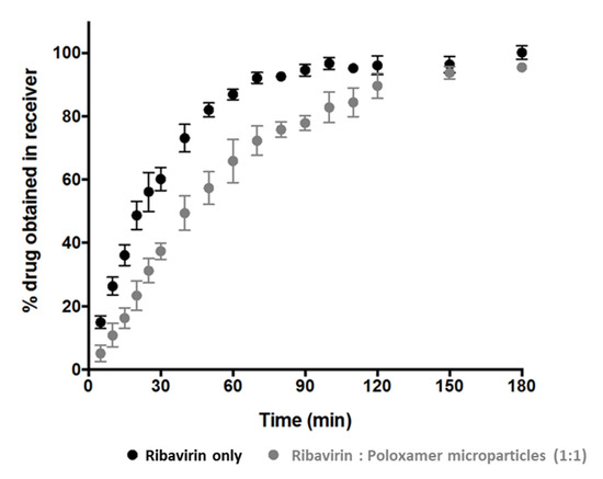 Owing to the complexity associated with this release method, additional investigations using fine ribavirin particles (sieve fraction 20–53 µm) were conducted to identify the influence of the barrier presented by the poloxamer matrix. The results indicate that the dissolution of ribavirin is not instantaneous, and yet approximately 70% of the drug dissolved and permeated through the cellulose membrane in 45 min and ~97% was in the receiver chamber after 180 min (Figure 4).