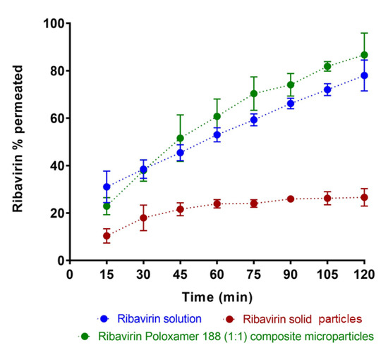 To provide a comparable drug exposure in the donor compartment, 10 mg of 1:1 ribavirin:poloxamer microparticles were deposited on the tissue (i.e., 10 mg of 1:1 binary microparticles contains 5 mg of drug). Notably, when the drug was introduced to tissue as 1:1 ribavirin:poloxamer microparticles, ribavirin dissolution was likely enhanced, and drug permeation was greater than for an aqueous solution of the drug, despite the increased viscosity of the poloxamer gel medium.