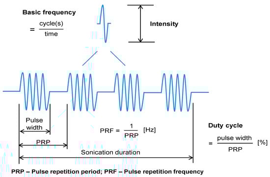 The source of US is most often a transducer containing a piezoelectric crystal, which is capable of converting an electrical signal into mechanical pressure waves [19]. These pressure waves cause, when passing, local oscillatory motion of particles through the transmitting medium which results in a local density change in the medium (succession of compression and decompression events). The applied acoustic pressure (measured in Pa) is directly related to the amount of energy received by the targeted tissue [14,19]. Biological effects induced by US application can be influenced by varying different parameters such as frequency, intensity or exposure time. In addition, US can be applied in a continuous or discontinuous mode (pulsed mode). A continuous application of US for a certain period of time of tissue exposure leads to overheating and tissue damage. This effect is clinically exploited for tumor tissue ablation [23]. In cases where tissue overheating is undesired, continuous waves can be broken down into several US pulses, so that energy dissipation occurs between pulses. Pulses can vary in length and are repeated periodically at a given frequency (repetition per second), which determines the duty-cycle (DC) of the US application [14] (Figure 1).