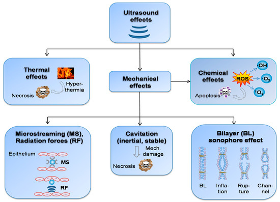 Several biological effects induced by US are exploited for treatment and drug delivery applications. They can be divided into two main groups: thermal effects, mechanical effects (occurring simultaneously), and, in their succession, also chemical effects (Figure 2).