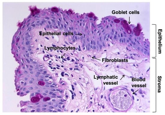 From a functional point of view, the conjunctiva realizes the mechanical, sensory, and immune protection of the ocular surface; the specialized secretion of fluid, electrolytes, and diverse components of the tear film [2], mainly mucins and antimicrobial peptides [6]; the modulation of the local inflammatory state; the regulation of tissue repair and fibrosis; neo-angiogenesis; and pain perception [7]. In addition, epithelial cells can respond to signals derived from the abundant microbiota resident on the ocular surface producing inflammatory cytokines [8]. Further, it is worth mentioning the contribution of the conjunctiva to the antioxidant system protecting the ocular surface with the expression of superoxide dismutase, catalase, glutathione synthetase, and glutathione reductase [9] and peroxiredoxin I [10], in addition to glutathione [11].