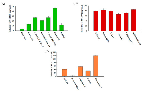 Solubility of AC1497 in various oils (A), surfactants (B), and cosurfactants (C) (mean ± SD, n = 3).