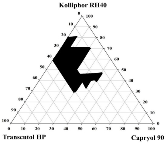 Pseudoternary phase diagram using Capryol 90 as an oil, Kolliphor RH40 as a surfactant, and Transcutol HP as a cosurfactant. The black area is the self-nanoemulsifying region.