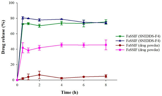 Drug release profiles of pure drug powder and SNEDDS-F4 were examined in the fasted-state simulated intestinal fluid (FaSSIF) and the fed-state simulated intestinal fluid (FeSSIF). The FaSSIF and FeSSIF were prepared as described previously [24,25,26]. Briefly, FaSSIF was composed of 3 mM sodium taurocholate, 0.2 mM lecithin, 19.12 mM maleic acid, 34.8 mM sodium hydroxide, and 68.62 mM sodium chloride. FeSSIF was composed of 10 mM sodium taurocholate, 2 mM lecithin, 55.02 mM maleic acid, 81.65 mM sodium hydroxide, 125.5 mM sodium chloride, 5 mM glyceryl monooleate, and 0.8 mM sodium oleate. The pH was adjusted to 6.5 and 5.8 for FaSSIF and FeSSIF, respectively. Drug release from the drug powder and SNEDDS-F4 was evaluated in FaSSIF and FeSSIF at 37 ± 0.5 °C and 50 rpm, as described in Section 2.7. The collected samples at predetermined time points (0.5, 1, 2, 4, 6, and 8 h) were passed through a syringe filter (pore size: 0.45 µm) and analyzed by HPLC assay.