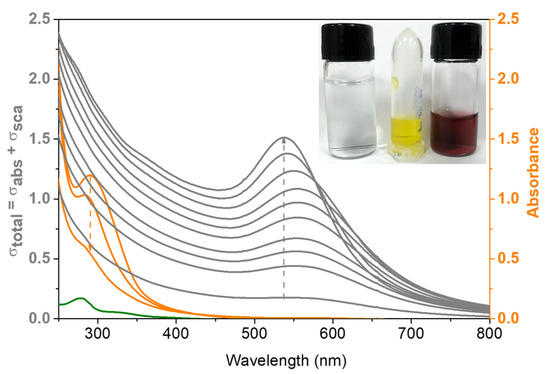 UV-Vis spectra acquired during the time-course of the NanoBro synthesis. Green line shows the HEPES-buffered Bro solution. Orange lines show the spectral changes of HAuCl4 in subsequent times after addition to Bro solution as indicated by the arrow. Gray lines show the increase of absorbance and turbidity resulted from NanoBro formation. The inset shows a snapshot of the HEPES-buffered Bro transparent solution, the yellow HAuCl4 aqueous solution and the red-wine GNP suspension. The synthesis was carried out at pH 7.0 at the temperature of 40 °C and the spectra were obtained in a quartz cuvette with 1 cm of optical path.