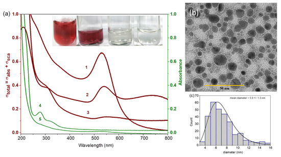 Characterization of nanoparticles. (a) UV-Vis spectra of NanoBro colloidal suspension produced with HEPES-buffered Bro (line 1), with HEPES and sodium phosphate (line 2), with aqueous solution of Bro (line 3). Green lines 4 and 5 correspond, respectively, to the spectra of HEPES-buffered Bro (0.2 mg/mL) and the supernatant of NanoBro synthesis (line 1) obtained by GNPs precipitation by centrifugation. The inset shows, from left to right snapshots of solutions 1–4. Spectra were obtained 4 days after the synthesis; (b) transmission electron microscopy (TEM) of NanoBro was obtained with magnification of 100,000× and energy of 80 kW; (c) histogram of NanoBro size distribution fitted as lognormal curve by Origin tool calculated a mean diameter of of 5.0 ± 1.3 nm.