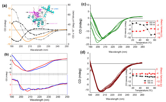 - Micsonai, A.; Wien, F.; Bulyáki, É.; Kun, J.; Moussong, É.; Lee, Y.H.; Goto, Y.; Réfrégiers, M.; Kardos, J. BeStSel: A web server for accurate protein secondary structure prediction and fold recognition from the circular dichroism spectra. Nucleic Acids Res. 2018, 46, W315–W322. [Google Scholar] [CrossRef]