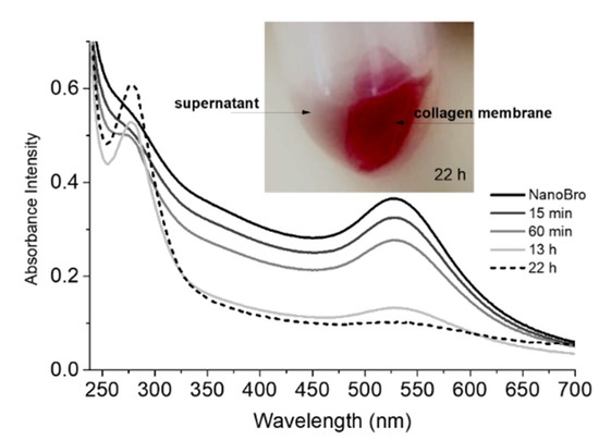 Incubation of the type I collagen membrane at 25 °C for 22 h resulted in progressive decoloration of the colloidal suspension with a concomitant change in the membrane color from opaque white to red color, indicating impregnation of NanoBro in the membrane structure (inset of Figure 4). The time-dependent color changes of the colloidal suspension were accompanied by spectral changes in the UV region of the spectrum with the appearance of a band peaking at 280 nm, which is consistent with the increased concentrations of peptides (Figure 4).