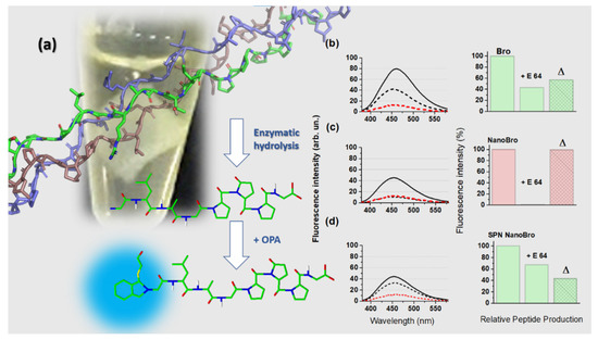 The collagenolytic activity of Bro and NanoBro indicates the production of peptides that can be detected by the reaction with o-phthalaldehyde (OPA), which reacts with primary amines of peptides to allow fluorescent detection and quantitation. OPA assays were carried out with solutions in which the collagen membranes were subjected to the proteolytic activity of Bro, NanoBro, and the supernatant of NanoBro synthesis. The membranes were incubated with PBS in the absence of enzymes. The use of the supernatant of NanoBro synthesis had the objective of detecting reminiscent enzymatic activity from Bro fractions that did not bind to GNPs. Each condition was tested in the absence and presence of E-64 to determine the contribution of cysteine protease activity to collagen hydrolysis. E-64 is selective for cysteine proteases and acts irreversibly by covalent binding with the reactive thiol group of the active site. Figure 5a shows a schematic illustration of the mechanism of the OPA assay for the relative quantification of peptides produced under each experimental condition. Figure 5b–d shows the relative fluorescence intensity obtained in the absence (solid line) and presence (dashed line) of E-64 for the enzymatic activity of Bro, NanoBro, and the supernatant of NanoBro synthesis, respectively. The fluorescence of the control solution is indicated by the red dashed lines. The fluorescence spectra obtained under each condition are presented as a bar graph showing the corresponding percentage of inhibition promoted E-64 and the difference (Δ) between the total enzymatic activity and the reminiscent activity in the presence of E-64, which corresponds to the percentage of cysteine protease activity of Bro, NanoBro, and the Bro fractions that remained free in solution. Considering that the non-enzymatic membrane fragmentation resulted in the same fluorescence intensity obtained with NanoBro and E-64, only cysteine protease activity was present in the enzymatic complex bound to GNPs. The lowest percentage of inhibition by E-64 was observed in the supernatant of NanoBro synthesis. Therefore, the enzymatic activity of NanoBro is exclusively a cysteine protease that could result from the selective binding of cysteine proteases by GNPs or inhibition of the bound enzymes that are not cysteine proteases. The preferential retention of cysteine protease fractions by GNPs is less probable because E-64 efficiently inhibits only ananain and comosain, which constitute only 6% of the total protein in bromelain. Thus, GNPs probably favor the activity of ananain and comosain, and this issue deserves further investigation.