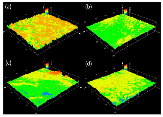 Confocal microscopy—Confocal images were obtained using a Zeiss microscope (LSM 510-Meta, Oberkochen, Germany) with a laser of 633 nm. The surface roughness and profiles were determined in a representative region of 2500 μm2 at a magnification of 500×. The measurements were performed at three points in the selected area and at a depth of 50 μm.