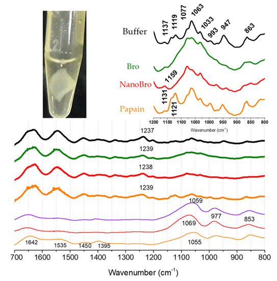 In the present study, ATR-FTIR was used to analyze the surface layer of the sample [35,36]. Figure 7 shows the ATR-FTIR spectra obtained from the collagen membrane samples (thick solid lines) and the supernatant solution resulting from the enzymatic hydrolysis (thin solid lines), in the spectral range of 1700 to 800 cm−1, which are attributed to the vibrations of specific functional groups of amino acids, proteins, and peptide chains. In the collagen membrane spectra, it was possible to identify the absorption bands between 1700 and 1300 cm−1 relative to amide I (~1650 cm−1), amide II (~1550 cm−1), and amide III bands (1400–1200 cm−1) [37]. No changes were observed in the spectral regions of amides I, II, and III of the membranes incubated with buffer or enzymes. This was expected because the proteolytic activity promotes leaching of the membrane layers but does not change the secondary structure of the reminiscent layers. The presence of a triple helical structure can be determined using the intensity ratio of amide III peaks at 1233/1450 cm−1 [37]. The presence of a triple helix was indicated by an absorption ratio above 1.0. The collagen membrane used here exhibited slight variations in the maximum at the 1200 cm−1 region (see indications in Figure 7), and the maximal value was used for the ratio calculation. The collagen membrane preserved the 1237–9/1450 cm−1 ratio >1.0 after treatment with Bro and NanoBro whereas the ratio becomes slightly < 1.0 after the exposure to papain. Consistent with the specific cleavage of collagen chains promoted by papain (orange line), Bro, and NanoBro, significant changes in the spectral regions corresponding to the side chains of some amino acids were observed in the membrane FTIR spectra, indicating a change in the microenvironment of these groups. The cleavage of collagen chains can modify the amino acid side chain microenvironment, such as the decrease in the spectral contribution around 1063 cm−1, which occurs only in Bro-and NanoBro digested samples. This band is attributed to the stretching of the C-C skeleton in a random conformation [38]. The presence of collagen chain fragments in the supernatant as a result of the digestion process is evident by the drastic change in the intensity ratio of the collagen-related helix bands (1700–1200 cm−1) with those related to the free amino acid side chain peptides (1200–800 cm−1). The peak absorption bands in the 853 cm−1 spectral region are related to the vibrations of the collagen-specific amino acids proline and hydroxyproline [38,39]. Thus, as an example, in the FTIR spectra of the membranes, the 1642/865 cm−1 absorbance ratio has a mean value of 1.15, while in the FTIR spectra of the supernatants, the ratio has a mean value of 0.89. However, in the spectrum of the supernatant containing the products of papain proteolysis, a higher contribution of amide I, II, and III bands was evident, and the 1642/865 cm−1 ratio in this spectrum was 0.92. This result suggests that free papain activity produces larger collagen fragments that retain some secondary structure. These results reinforce that Bro has collagenase activity preserved in NanoBro.