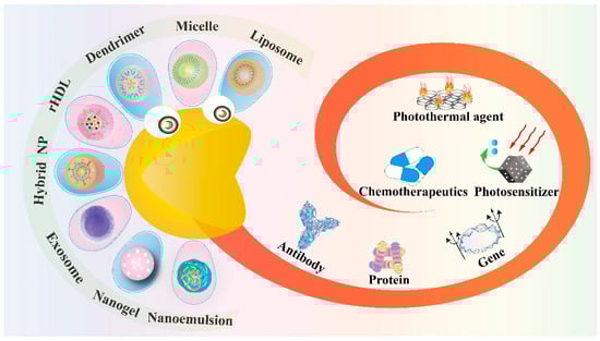 Typical nano-based delivery vehicles include liposome, micelle, dendrimer, inorganic vector, nanogel and nanoemulsion, while novel nanocarriers also contain biomimetic reconstituted high-density lipoprotein (rHDL), exosome and the hybrid nanoparticle, which come from the mixture of nanomaterials [6]. Each of these nanotools displays its unique physiochemical properties and possesses the ability for further modification of active targeting ligands. Therefore, this review focuses on the application of nanotechnology in cancer therapy and discusses how these nanoparticles (NPs) encapsulate the therapeutic agents in targeted drug delivery (Figure 1). Table 1 is a summary of all these nanostructures discussed below and their corresponding encapsulation of anticancer agents.