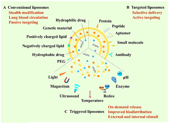 Liposome, structured by natural non-toxic phospholipids and cholesterol, is a spherical vesicle containing an aqueous inner compartment and a phospholipid bilayer, which is able to load both hydrophilic and hydrophobic cargos [43,44]. Structurally, the similar composition with the biological membrane allows cells to take up liposomes more easily and cause lower toxicity [45]. Liposomes represent one of the most promising delivery vehicles for anticancer therapy owing to their biocompatibility, high loading capacity and modifiable sites [46]. So far, they are the most widely developed nanomedicines and are also the most likely to be put onto the market [47]. According to the development of liposomes, they can be classified into conventional liposomes, targeted liposomes and triggered liposomes. The first conventional liposomes mainly adopt the stealth strategy to escape capture by the reticuloendothelial system (RES) and to prolong blood circulation [48]. Polyethylene glycol (PEG) is the most widely used material for the stealth modification of the liposomes, thus the PEGylated liposomes are also called stealth liposomes [49]. Furthermore, stealth liposomes can achieve passive targeting by virtue of the EPR effect [50]. In 1995, Doxil®, as the first stealth liposome encapsulating doxorubicin (DOX), was approved by the FDA for the clinical application of cancer treatment [51]. However, recent research has reported that PEGylated liposomes can elicit unexpected immune responses, such as the accelerated blood clearance (ABC) phenomenon [52]. In this case, the long-circulating properties of PEGylated liposomes will decrease when administered repeatedly at certain intervals to the same animal [53]. To achieve selective delivery, targeted liposomes were developed by modifying various active targeting ligands including antibodies, aptamers, small molecules and peptides to the surface of the membrane of liposomes to target the specific receptors of tumor cells [54,55]. Recently, stimuli-responsive liposomal systems have emerged as an attractive approach for the on-demand release of encapsulated drugs. This kind of liposome can respond to specific stimuli, either external stimuli such as light, temperature, ultrasound and magnetism, or internal stimuli such as pH, enzyme and redox [56,57]. Additionally, liposomes can co-load multiple drugs with different structures, ranging from small molecules to macromolecules such as proteins and genes, for combination administration to improve the therapeutic efficacy [58]. Therefore, liposomes play a vital role in anticancer targeted drug delivery and are of great research and clinical interest (Figure 2).