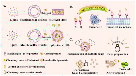 Schematic introduction of reconstituted high-density lipoprotein (rHDL). (A) Preparation process of spherical rHDL and discoid rHDL. (B) Active targeting ability of rHDL through scavenger receptor class B type I (SR-BI)-mediated specific targeting. (C) Various advantages of rHDL as a drug delivery vehicle.