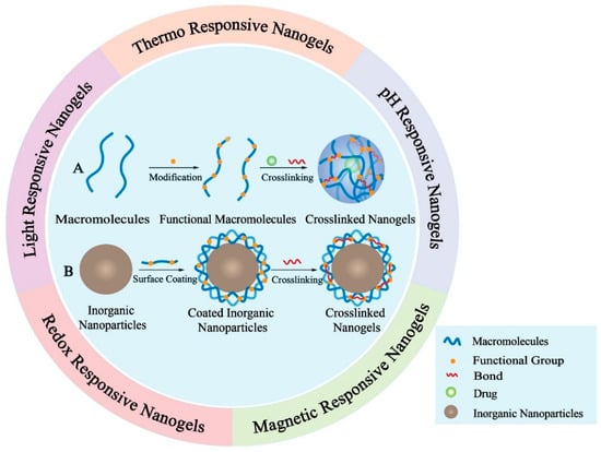 Schematic demonstration of nanogels. The inner circle illustrates the preparation of two representative crosslinked nanogels. (A) Preparation of macromolecules-based crosslinked nanogels; (B) Preparation of inorganic nanoparticles-based crosslinked nanogels. The outer circle demonstrates five typical stimuli-responsive nanogels. The drugs encapsulated will be released from nanogels after triggered by different stimulus like temperature, pH value, magnetic field, redox potential and light.