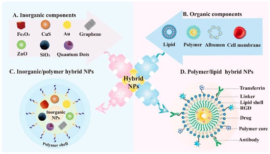 Schematic illustration of hybrid NPs. The representative inorganic nanomaterials (A) and organic nanomaterials (B) applied in hybrid NPs. (C) Composition of inorganic/polymer hybrid NPs. The combination of each type of inorganic core with the corresponding polymer results in hybrid NPs with different properties. (D) Structure of polymer/lipid hybrid NPs which consists of a polymer core encapsulating drugs and lipid shell. The lipid shell can also conjugate to a variety of targeting agents like antibodies, arginyl glycyl aspartic acid (RGD) and transferrin to ensure target delivery.