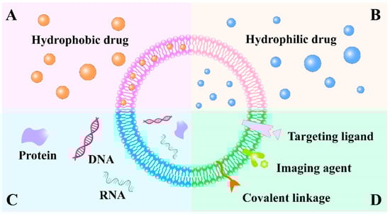 Schematic illustration of various types of exosome-based drug delivery systems. Exosomes are composed of a lipid bilayer that consists of lipids to enclose an aqueous core. Both the lipid bilayer and the aqueous core can incorporate (A) hydrophobic drugs and (B) hydrophilic drugs. (C) Exosomes can be used to deliver macromolecules such as DNA, RNA and protein. (D) Theranostic or imaging probes, specific targeting ligands and covalent linkage can also be attached to exosome surface for biomedical application.