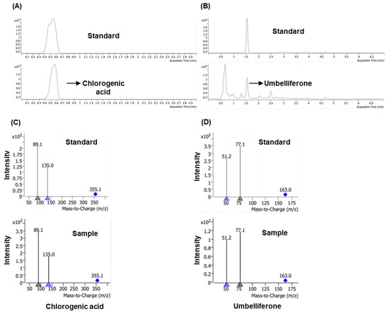 Concentration of chlorogenic acid and umbelliferone in Morus alba root extract (MARE). High-performance liquid chromatography (HPLC) chromatogram of (A) standard sample of chlorogenic acid and MARE (B) standard sample of umbelliferone and MARE. Product ion spectra of (C) chlorogenic acid standard (above) and sample (below) and (D) umbelliferone standard (above) and sample (below).