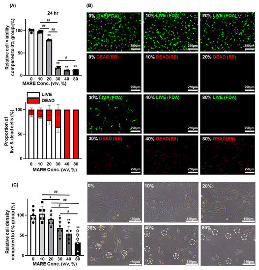 The optimal concentration of MARE was determined by evaluating the viability of HFDPCs at different concentrations of MARE (10, 20, 30, 40, and 80 v/v, %). The viability of the HFDPCs was similar in the 0% group, 10% group showed 98% of live cells, and it was slightly decreased in the 20% group (80% compared to that of the 0% group). The viability of the HFDPCs in other groups dramatically decreased by 17%, 11%, and 11% in 30%, 40%, and 80% groups, respectively, compared to those of 0% group (Figure 2A, upper panel). Cell viability was analyzed using an FDA/EB assay. Few dead cells were observed in the 0–20% group, whereas dead cells were dominant in the other groups (Figure 2A: lower panel and Figure 2B). In terms of HFDPCs density after MARE treatment, similar density in unit area (mm2) was observed in the 0–20% group (103% in 10% group and 90% in 20% group compared to that of the 0% group). However, the 30–80% group showed decreased cell density (67% in the 30% group, 54% in the 40% group, and 32% in the 80% group compared to that of the 0% group), which was similar to the result observed in viability test (Figure 2C, left panel). In comparison with the HFDPCs showing normal cell morphology, in the 0–20% group, morphological changes in the MARE-treated HFDPCs showed similar cell viability. The HFDPCs in the 30–80% group showed diminished and shrunken cell morphology, indicating cell death (Figure 2C, right panel, circled) [35]. These results indicate that treatment with 20% MARE might be suitable for HFDPCs.