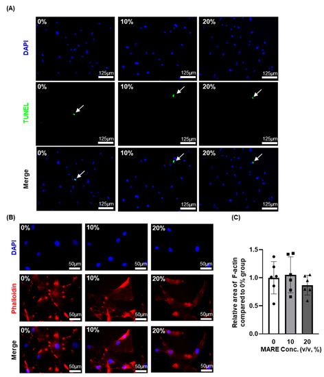 Effect of 0 to 20% concentration of MARE on the HFDPCs. (A) Terminal deoxynucleotide transferase-mediated deoxyuridine triphosphate nick-end labeling (TUNEL) assay results of MARE-treated HFDPCs. Cell nucleus was stained with 4′,6-diamidino-2-phenylindole (DAPI) (blue), and apoptotic cell was stained with fluorescent-dUTP (green, arrow marked). (B) DAPI and phalloidin staining results of MARE-treated HFDPCs showing F-actin expression. (C) Quantification of F-actin area compared to the 0% group (n = 6).