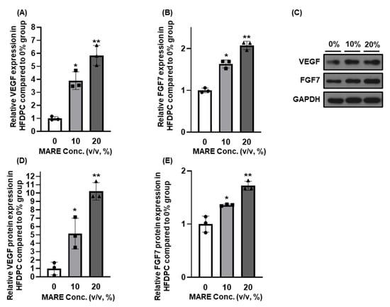Effect of MARE on (A) vascular endothelial growth factor (VEGF), (B) fibroblast growth factor 7 (FGF7) (n = 3, * p < 0.05, ** p < 0.001 compared to the 0% group). Representative results of (C) VEGF, FGF7 protein expression, and their (D,E) quantification (n = 3, * p < 0.05, ** p < 0.001 compared to the 0% group).