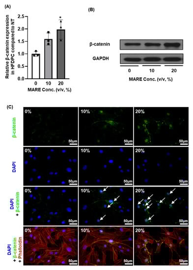 Activation of β-catenin in dermal papilla cells is crucial for inducing anagen state, growth factor secretion, and hair follicle formation [39,40,41]. To investigate β-catenin activation in HFDPCs using MARE treatment, we examined β-catenin gene expression using qRT-PCR in 0–20% MARE-treated HFDPCs. Compared to the 0% group, β-catenin expression was upregulated 1.59- (p < 0.078) and 1.97-fold (p < 0.05) in the 10% and 20% groups, respectively (Figure 5A). Protein expression was assessed using Western blotting and showed a similar trend as the gene expression; the bands increased with an increase in MARE concentration (Figure 5B). β-Catenin translocates into the nucleus to promote growth factor expression, thereby increasing its secretion [42,43]. Immunocytochemistry assay revealed that high-concentration MARE treatment increased β-catenin expression in the nucleus, which further increased the expression of growth factors (Figure 5C).