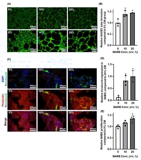 Effect of conditioned media (CM) retrieved from MARE-treated HFDPCs on human umbilical vein endothelial cells (HUVECs) and normal human epithelial keratinocytes (NHEKs). (A) Tubular formation of HUVECs observed at 5 h after CM treatment. (B) Quantification of the tube formation in HUVEC compared to the 0% group (n = 3, * p < 0.05 compared to the 0% group, one-way ANOVA test). (C) Immunocytochemistry (ICC) of involucrin (green) in NHEK merged with DAPI (nucleus, blue) and phalloidin (F-actin, red). (D) Relative data of involucrin expression (* p < 0.05 compared to the 0% group, one-way ANOVA test). (E) Proliferation of NHEKs 3 d after CM treatment (n = 4, * p < 0.05 compared to the 0% group).