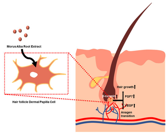 Restoring hair follicles by inducing the anagen phase is a promising approach to prevent hair loss. Hair follicle dermal papilla cells (HFDPCs) play a major role in hair growth via the telogen-to-anagen transition. The therapeutic effect of Morus alba activates β-catenin in HFDPCs, thereby inducing the anagen phase. The HFDPCs were treated with M. alba root extract (MARE) to promote hair growth. It contains chlorogenic acid and umbelliferone and is not cytotoxic to HFDPCs at a concentration of 20%. It was demonstrated that a small amount of MARE enhances growth factor secretion (related to the telogen-to-anagen transition). Activation of β-catenin was observed in MARE-treated HFDPCs, which is crucial for inducing the anagen phase. The effect of conditioned medium derived from MARE-treated HFDPCs on keratinocytes and endothelial cells was also investigated. The findings of this study demonstrate the potency of MARE in eliciting the telogen-to-anagen transition.