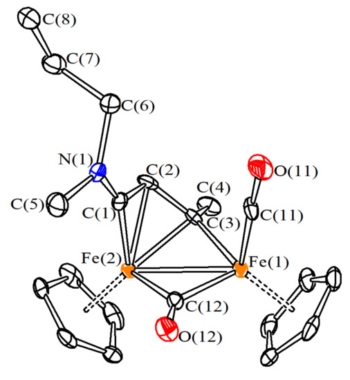 - Albano, V.G.; Busetto, L.; Monari, M.; Zanotti, V. Reactions of acetonitrile di-iron μ-aminocarbyne complexes; synthesis and structure of [Fe2(μ-CNMe2)(μ-H)(CO)2(Cp)2]. J. Organomet. Chem. 2000, 606, 163–168. [Google Scholar] [CrossRef]