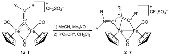 - Albano, V.G.; Busetto, L.; Marchetti, F.; Monari, M.; Zacchini, S.; Zanotti, V. Stereochemistry of the insertion of disubstituted alkynes into the metal aminocarbyne bond in diiron complexes. J. Organomet. Chem. 2004, 689, 528–538. [Google Scholar] [CrossRef]