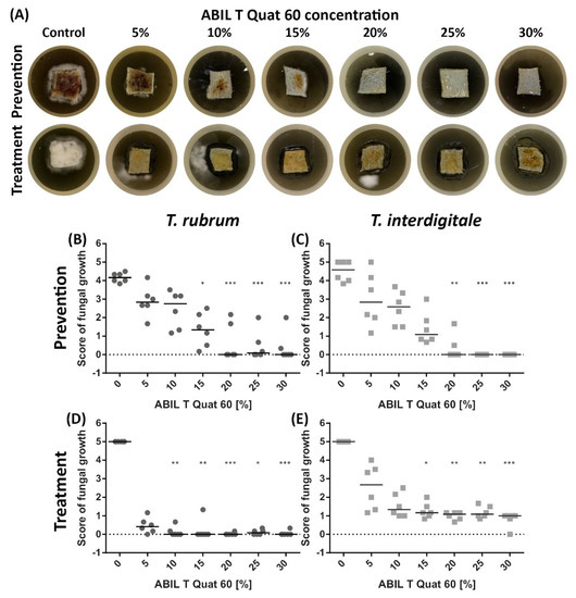Effect of ABIL (5–30%) on the ex vivo fungal growth of T. rubrum and T. interdigitale in prevention and treatment experiments. (A) Representative images of fungal growth on porcine skin to which ABIL was applied before inoculation with T. rubrum (prevention) or treated with ABIL 3 days after inoculation with T. rubrum (treatment). Panels (B–E) show the median scores values for fungal growth (Table 1): (B): Prevention of T. rubrum growth; (C): Prevention of T. interdigitale growth; (D): Treatment of T. rubrum infected skin; (E): treatment of T. interdigitale infected skin. Statistical analysis was performed using a Kruskal-Wallis ANOVA followed by Dunn’s post hoc test: n = 6/group: * p < 0.05, ** p < 0.01, *** p < 0.001 vs. control.
