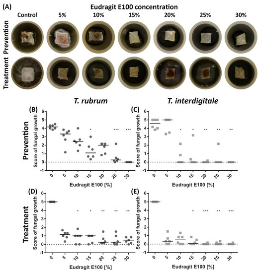 Effect of Eudragit (5–30%) on the ex vivo fungal growth of T. rubrum and T. interdigitale in prevention and treatment tests. (A) Representative images of fungal growth on porcine skin to which Eudragit was applied before inoculation with T. rubrum (prevention) or treated with Eudragit 3 days after inoculation with T. rubrum (treatment). Panels (B–E) show the median score values of fungal growth (Table 1): (B): Prevention of T. rubrum growth; (C): Prevention of T. interdigitale growth; (D): Treatment of T. rubrum infected skin; (E): Treatment of T. interdigitale infected skin. Statistical analysis was performed using a Kruskal-Wallis ANOVA followed by Dunn’s post hoc test: n = 6/group: * p < 0.05, ** p < 0.01, *** p < 0.001 vs. control.