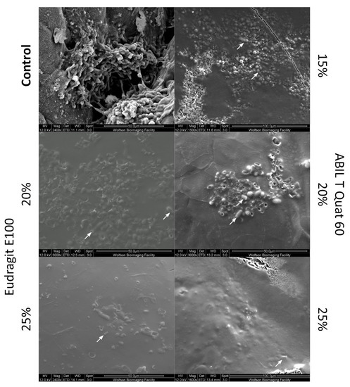Cryo-SEM was used to visualize the effects of ABIL and Eudragit in the prevention strategy, in which polymer films were formed on porcine skin, followed by inoculation with microconidia. Based on the results of the ex vivo study (Figure 1 and Figure 2), cryo-SEM was used to study samples with polymeric films made with 15–25% ABIL and 20–25% Eudragit. In the absence of polymer, after 24 h of growth, conidia and developing hyphae are visible in the control images (Figure 3; control panel). When 15–25% ABIL was applied, only conidia were observed after 24 h, indicating that the polymer prevented germination of the spores. As the polymer concentrations were increased, conidia appeared completely embedded in the polymeric film. Similarly, the application of 20% or 25% Eudragit resulted in the conidia being embedded with polymer and failure of the conidia to germinate.
