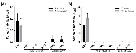 Inhibition of T. rubrum and T. interdigitale growth by ABIL and Eudragit based on fungal viability determined using phenol red (A) and adherence using crystal violet (B).
